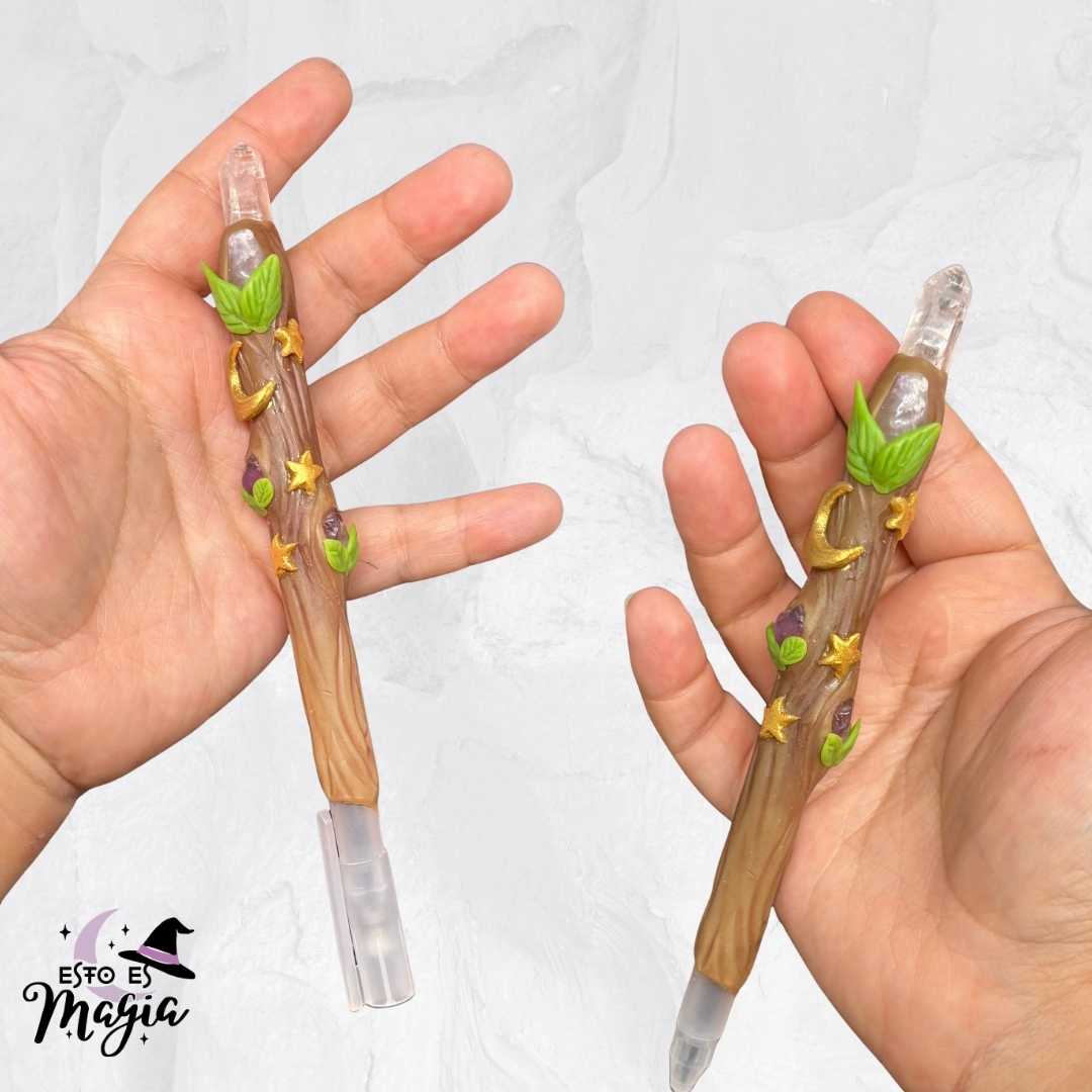 Bolígrafo mágico, decorado con apliques de Astrología y Magia de Cuarzos y una punta de Cuarzo Blanco.